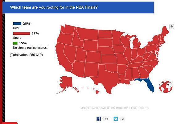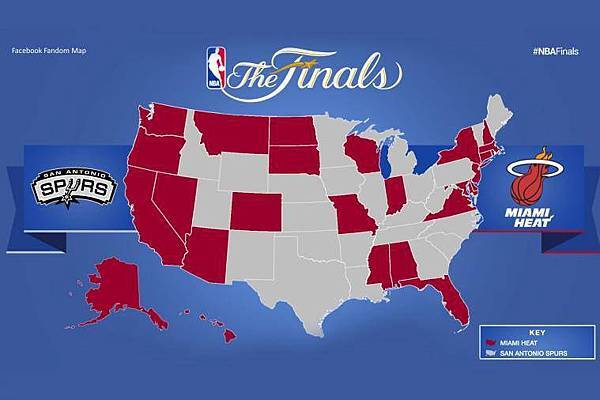 Facebook分析...共有26個州支持熱火...24個州支持馬刺