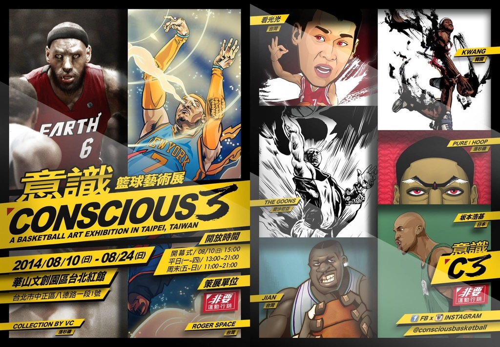「CONSCIOUS 3 意識」籃球藝術展,今年重返台北擴大舉辦,進駐台北最指標的文創基地「華山1914文創園區 – 台北紅館」盛大展出,兩位年輕藝術家黃敬中、常文崢在一年的時間內將發源於台灣的「CONSCIOUS意識展」帶到美國洛杉磯展出「CONSCIOUS 2」後又重返台北,此次與「非要運動行銷」合作,集結世界各地,包含日本、韓國、美國、愛沙尼亞以及台灣致力於創作籃球藝術的創作者,運用各式創作手法如插畫、影像處理、雕塑等方式,將「CONSCIOUS意識」主題進一步詮釋,除了捕捉住賽場上運動員的體態動作,歌頌人體的力與美之外,更添加了隱喻符號或誇張想像,讓美的層次不僅僅停留在視覺的欣賞,更是把視覺添加了「意識」,讓觀者能有更多的自我「意釋」。